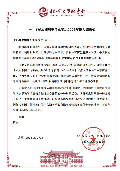 《可再生能源》入編《中文核心期刊要目總覽》2023年版之能源動(dòng)力工程類核心期刊
